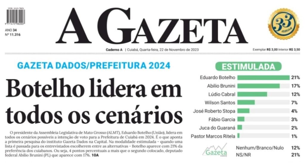 O deputado estadual Eduardo Botelho aparece em 1º lugar como o preferido da população, entre os postulantes à Prefeitura de Cuiabá em 2024. Com a manchete: Botelho lidera em todos os cenários, o Jornal A Gazeta publicou, nesta quarta-feira (22), matéria assinada pelo jornalista Pablo Rodrigo, sobre o resultado da primeira pesquisa feita pelo instituto Gazeta Dados na Capital.